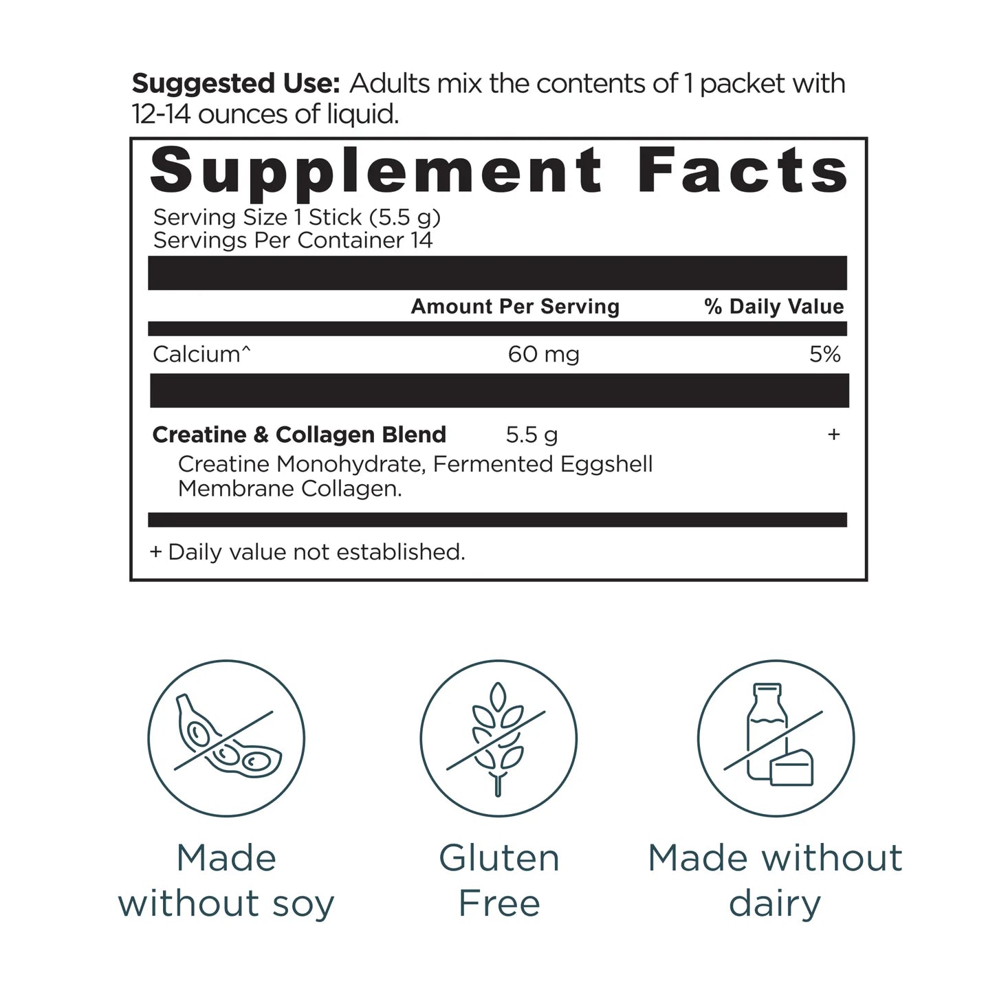 These convenient stick packs combine 5g of creatine monohydrate and clinically validated fermented eggshell membrane collagen to support lean body mass, recovery and cognitive health.*