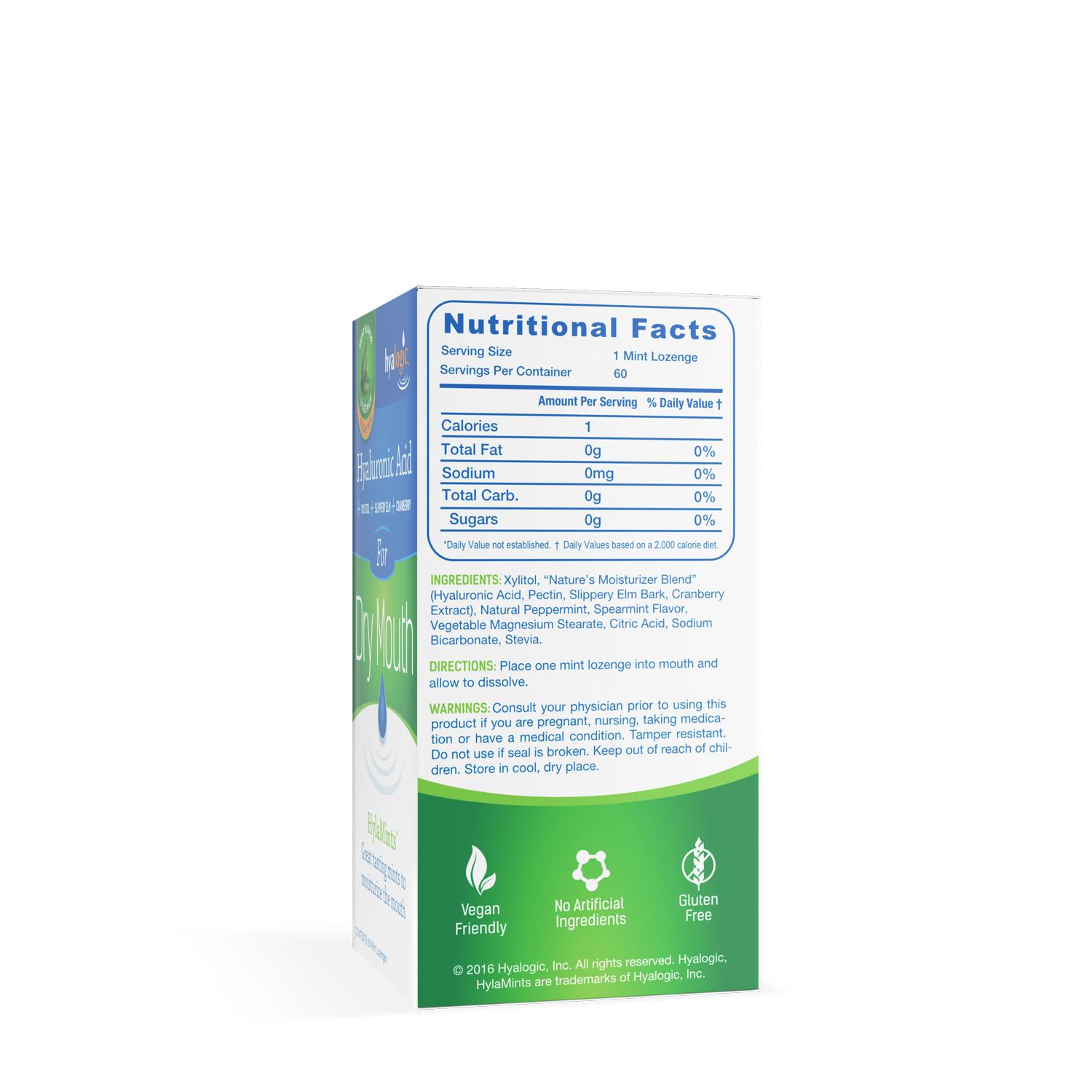 While HylaMints™ natural sweet mint flavor helps freshen your breath, its moisture-support power comes from a combination of ingredients starting with Hyaluronic Acid, a water-loving molecule that’s found naturally all throughout your body.