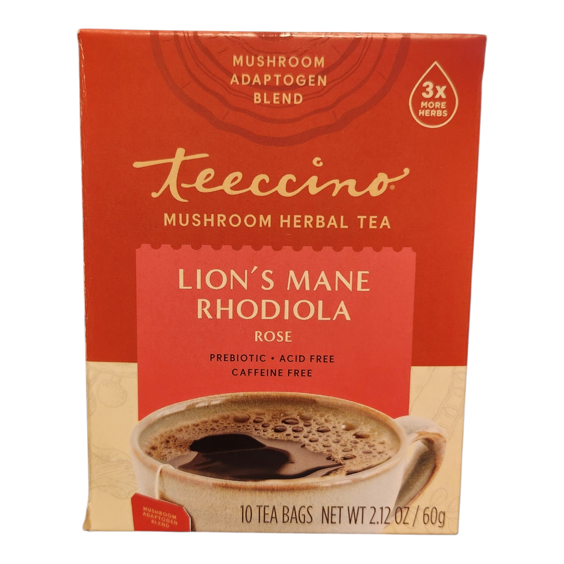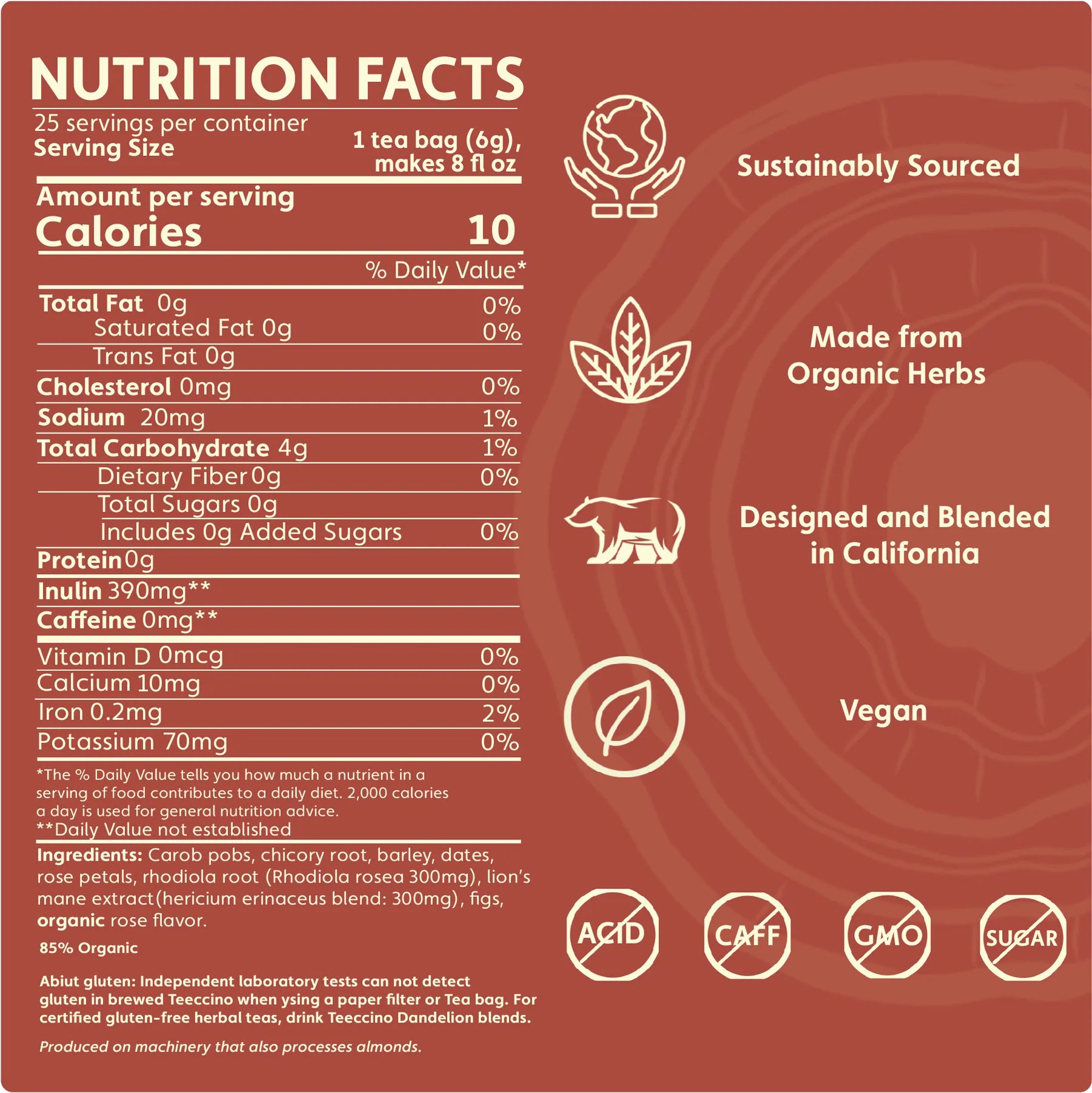 The light aroma of rose from mood-balancing rhodiola is highlighted with rose petals and strengthened with lion’s mane’s protective properties; lightly sweetened with dates and figs.