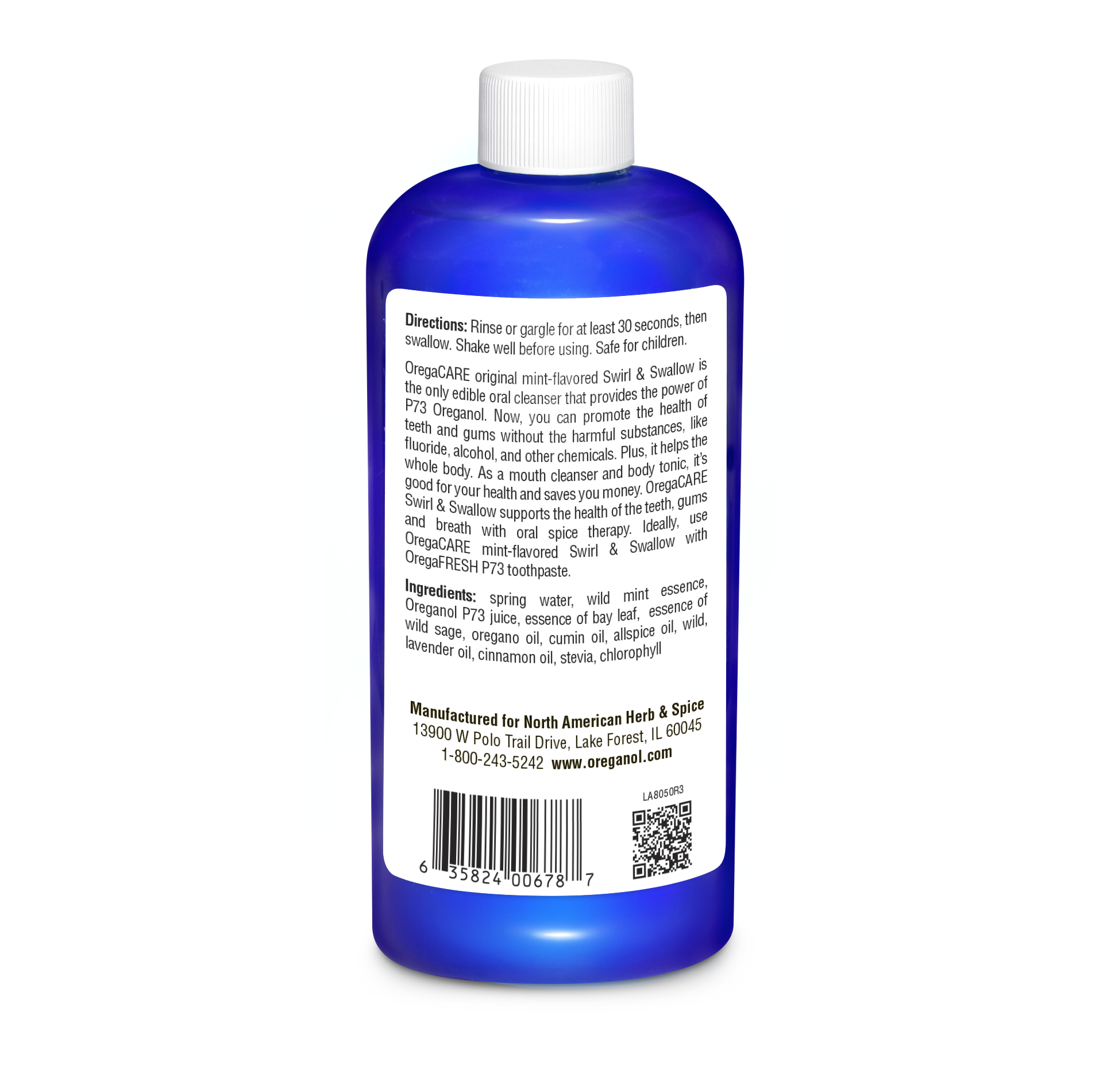 Mint OregaCARE Swirl & Swallow Mouthwash is the only edible oral cleanser that provides the power of P73 oregano. Now you can promote the health of teeth and gums without the use of harmful substances like fluoride and other chemicals. Plus, it helps the whole body. As a mouth cleanser and body tonic, its good for your health and saves you money.