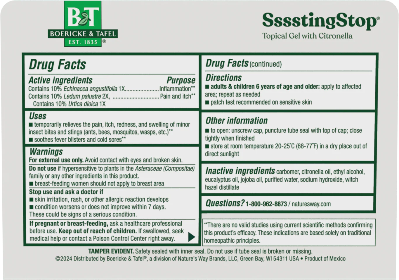 This homeopathic topical gel also helps relieve the itch and pain of cold sores and fever blisters. Ssssting Stop helps relieve red, itchy, and painful insect bites and stings, plus itching caused by plants like poison ivy, poison oak, and poison sumac.*