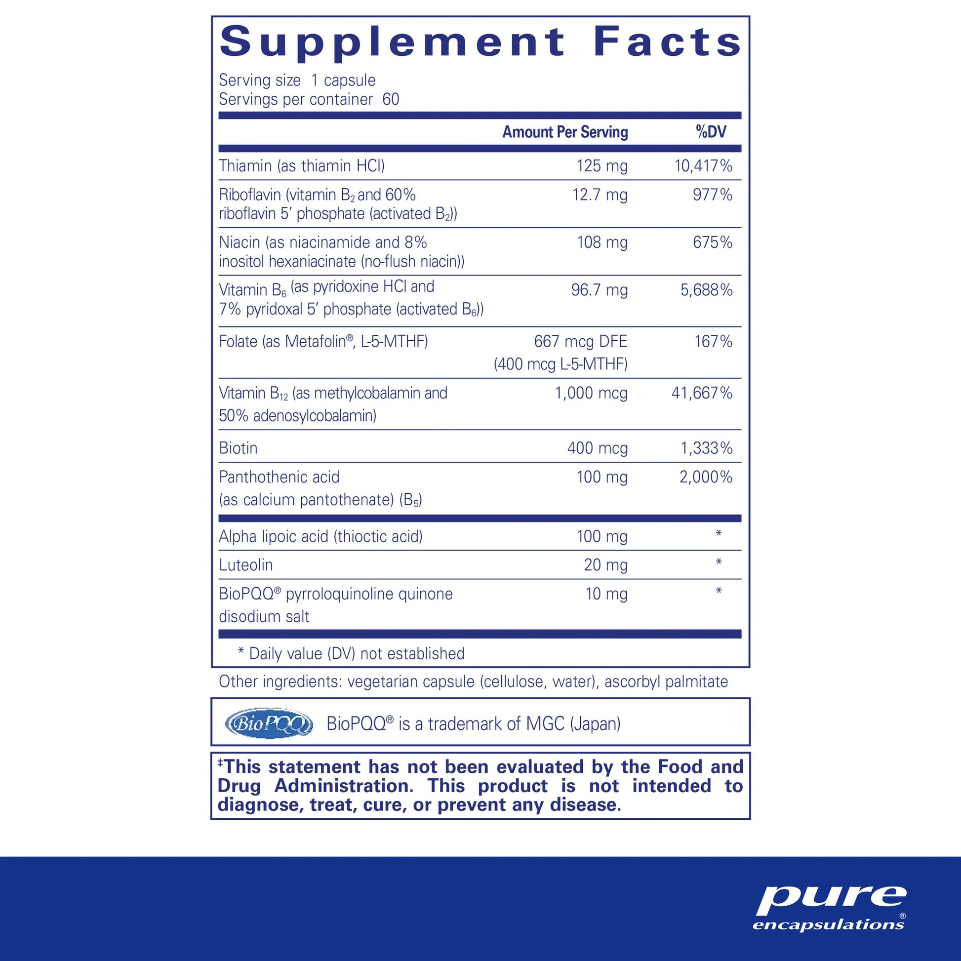 Ultra B-Complex with PQQ combines essential B-complex vitamins with PQQ, a vitamin-like compound with antioxidant properties. This supplement offers broad-spectrum support for cellular energy and nerve health.*
