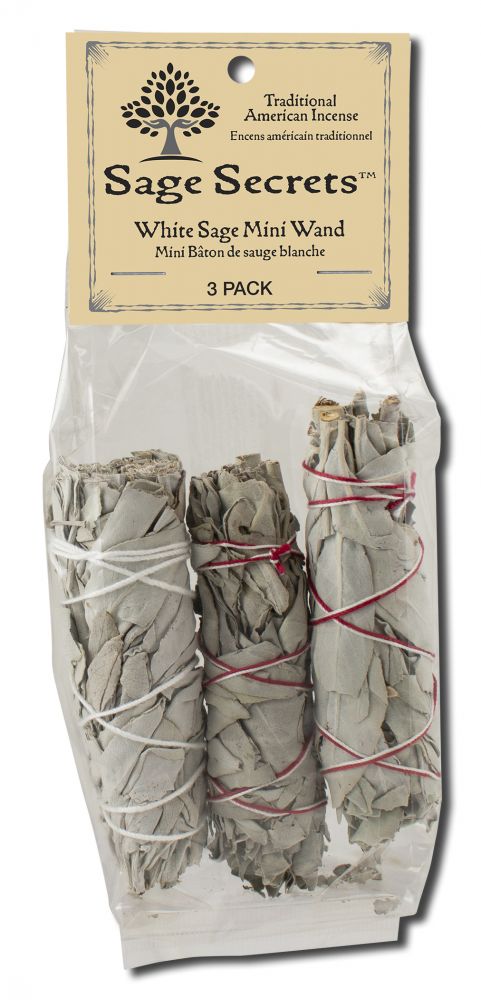 A compact trio of hand‑bound white sage wands (~3″ each), crafted for quick and convenient space‑cleansing rituals with a subtle, herbaceous smoke.
