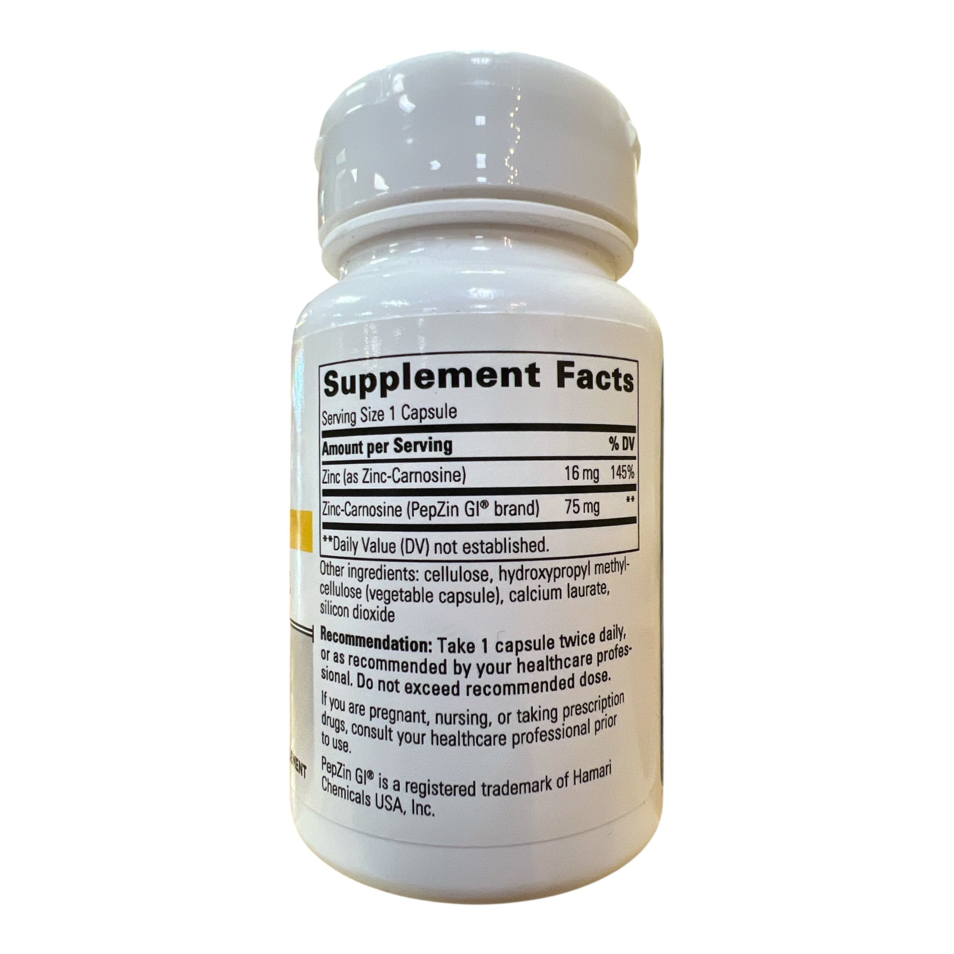 Zinc Carnosine contains the PepZinGI brand of zinc-carnosine to support healthy gastrointestinal mucosa and relieve occasional mild gastric discomforts.* After years of development, a Japanese company produced PepZinGI®, a novel patented crystalline chelate compound consisting of L-carnosine and zinc.